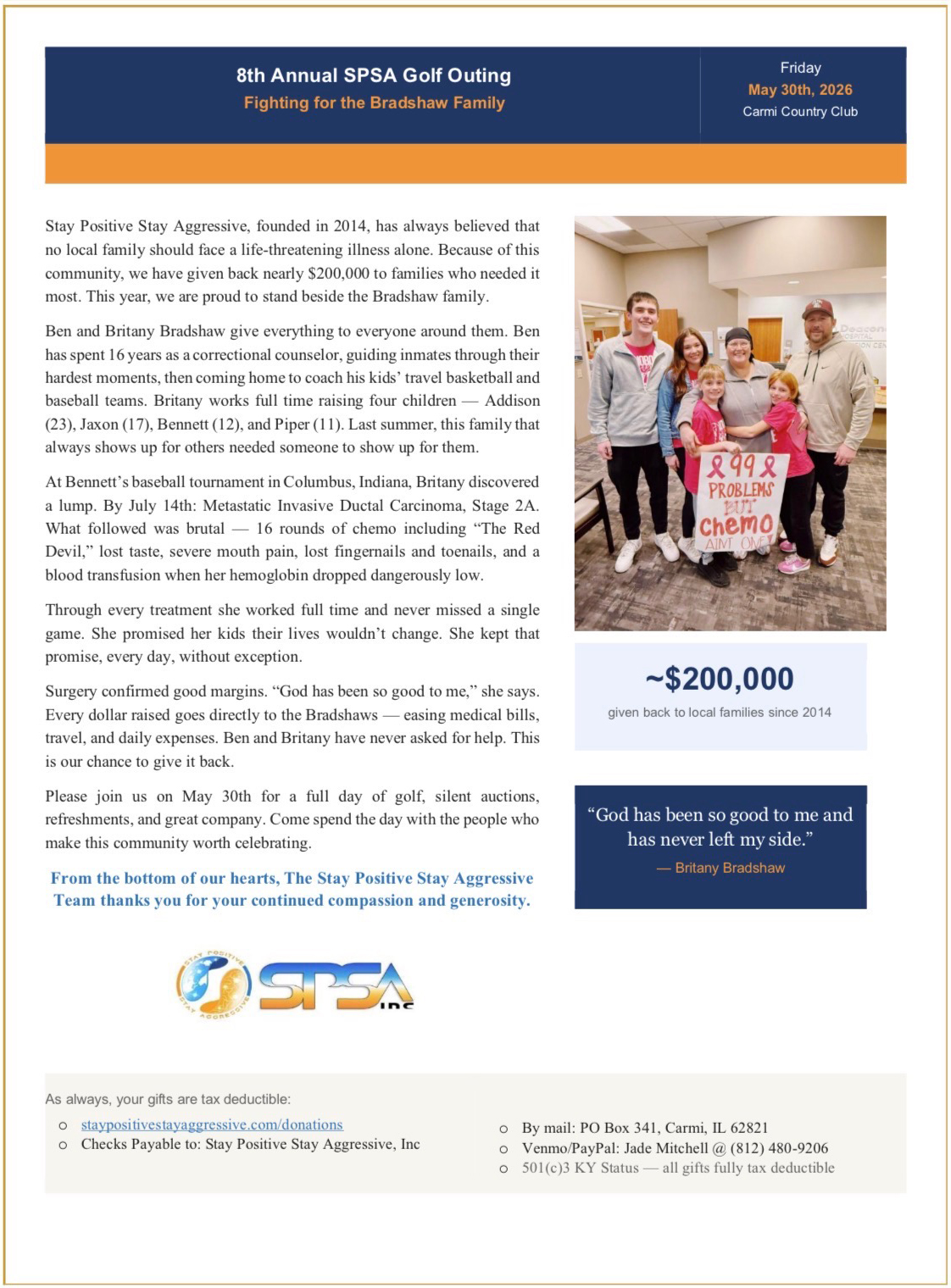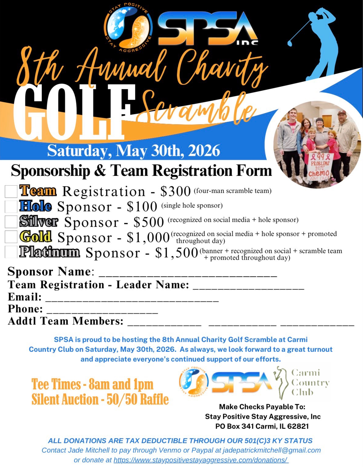 « All Events 8th Annual SPSA Golf Scramble May 30 @ 8:00 am - 6:00 pm Download / Print the PDF sign up sheet here Add to calendar Google Calendar iCalendar Outlook 365 Outlook Live Details Date: May 30 Time: 8:00 am - 6:00 pm Event Category: Fundraiser Event Tags:spsa fundraiser, spsa golf scramble, stay positive stay aggressive, staypositivestayaggressive Organizer Jade Mitchell Venue Carmi Country Club 883 County Rd 1350 N Carmi, IL 62821 United States + Google Map Phone (618) 384-5011